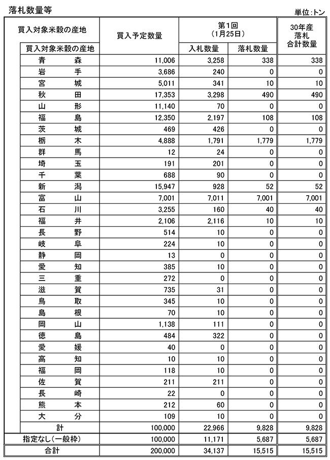 政府は備蓄米の買入れ数量を決め播種前に産地と買入れ入札を行っている。30年産の買入数量は20万tとしたが1月25日の第1回入札では落札数量は1万5515tにとどまった。