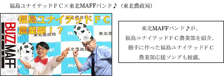 すでに、東北農政局による「福島ユナイテッドFCと東北MAFFバンド♪」で同FCの農業部を紹介、勝手に作った応援ソングを披露。また、「BUZZ MAFF」の人気ユーチューバーで広報評価課広報室のTASOGARE松岡による、松本山雅FCとのコラボ動画では、山雅農業プロジェクトで収穫した青大豆「あやみどり」を紹介している。