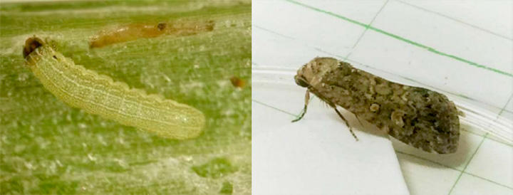 シロイチモジヨトウ幼虫(左)と成虫
