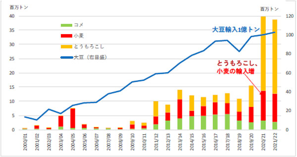 上昇の要因の1つがトウモロコシ価格の高騰。中国がアフリカ豚熱被害から回復し畜産再建でトウモロコシを大量に買い付けるようになっている。豚の飼養方法で近代化を進めており飼料が大量に買い求められている。その影響で飼料用小麦の需要も拡大。世界一の1.3億tの生産量がある中国は飼料用も含めて小麦を買い付けている。
