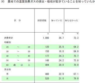 農林水産省が4月20日に公表した「農業分野の地球温暖化緩和策に関する意識・意向調査」では1000人の消費者からも回答を得ている。回答をみると、農業や食品の地球温暖化への影響について、若い世代(20~29歳)で他世代より認知度や関心が高いことがうかがわれる。