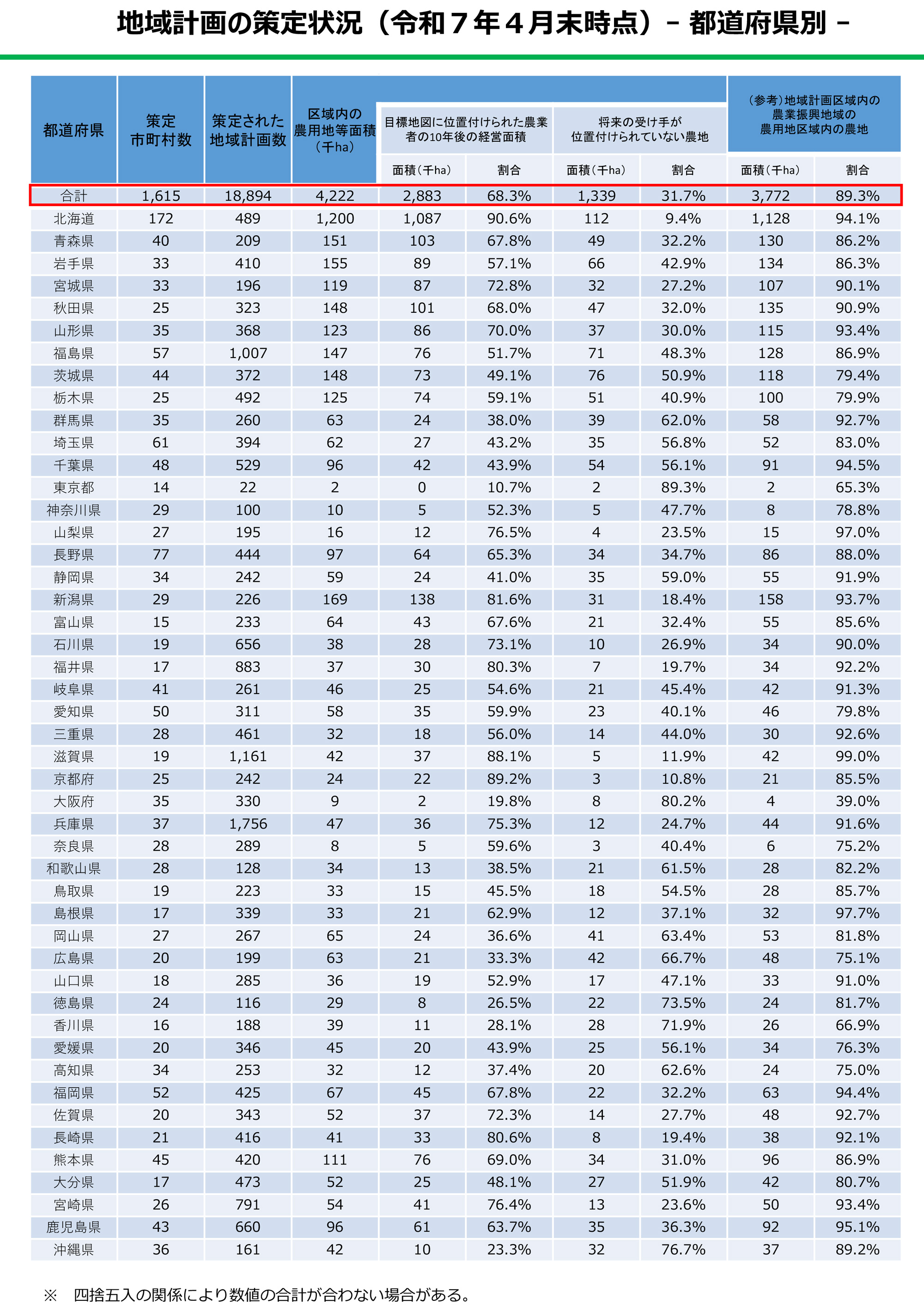 農水省は地域計画を継続して見直すことが必要で地域で話し合いを進め、計画をブラッシュアップするため、優良事例の横展開や担い手の確保、農地集約化を支援するとしている。