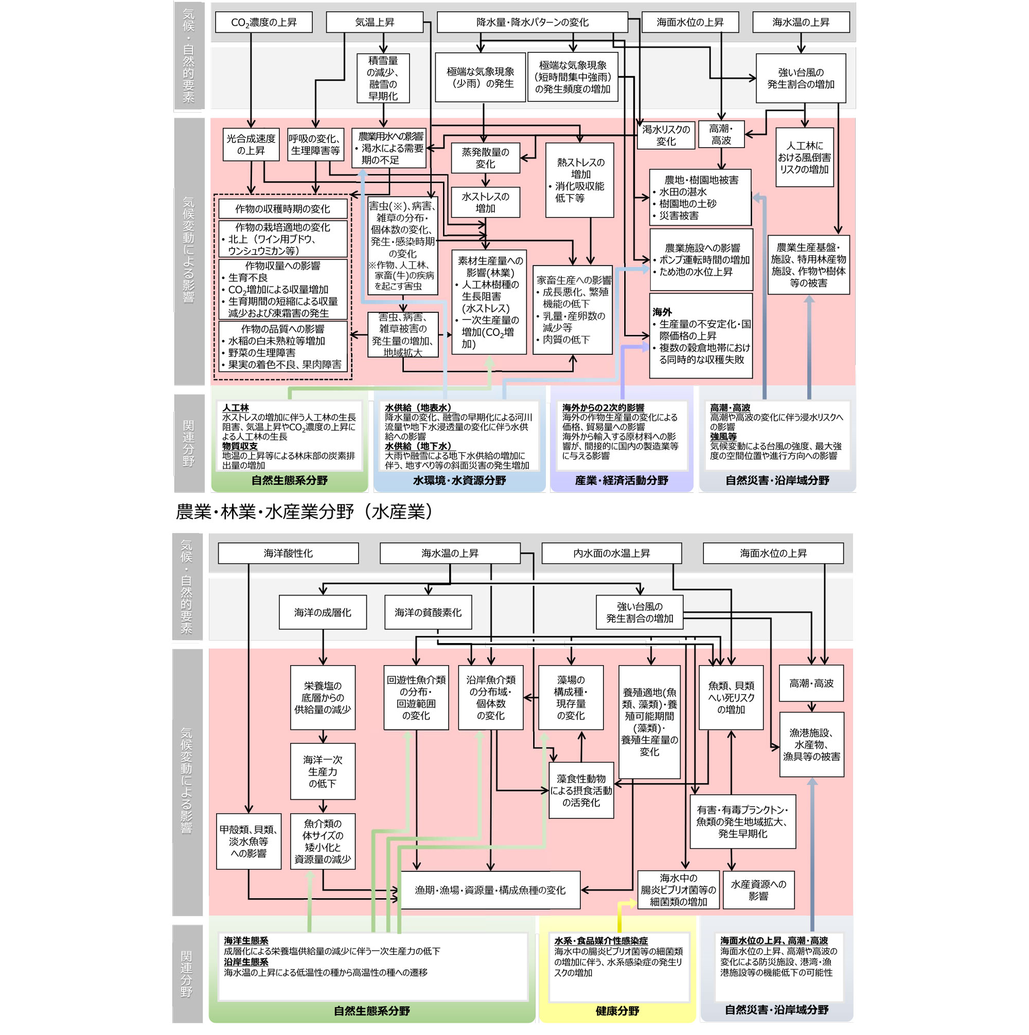 農業への影響には「気温や水温、CO2濃度の上昇といった気候変動の直接的な原因によるものと、水資源量の変化や自然生態系の変化を介した間接的な原因によるものがある」(報告書p40)。