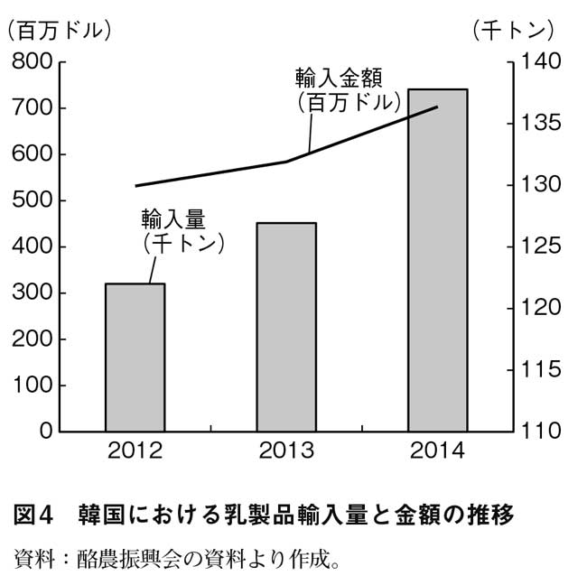 まず酪農に関しては図4を参照されたい。図4は主要乳製品の輸入量と金額の推移を示しているが、米韓FTA発効を境に、大幅な増加が見られる。もちろん2010年に韓国内で発生した口蹄疫によって国内生産が打撃を受けたことにも影響があるとはいえ、輸入金額は2012年のおよそ5億ドル(約568億円)から、2014年には7億ドル(795億円)にまで膨らんでいる。