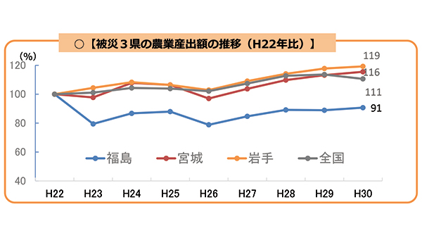 一方、福島県でも原発事故被災地は厳しい状況にある。2019年に福島県の農産物輸出量は前年を上回る305tとなり過去最高を記録した。しかし、岩手、宮城の農業生産額が震災前を上回ってそれぞれ119%。111%と回復してきたのに対し、福島は91%となっている(2018年)。