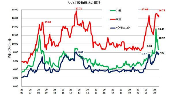 ロシアによるウクライナ侵攻から5カ月が経過し、戦争は長期化の様相を呈するなか、シカゴ穀物価格は6月以降、ひとまず騰勢一服となっている。7月8日時点では、小麦が1ブッシェル=9ドルを割り込み、今年2月の侵攻前のレベルになった。ただ、大豆は17ドル弱、トウモロコシは8ドル前後と高止まりしており、2012年の過去最高値を見据えた動きとなっているのには変わりがない(図1)。