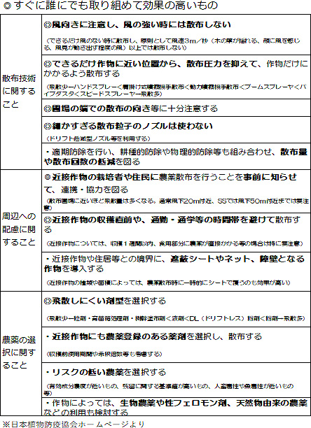 この他、対策の詳細が日本植物防疫協会ホームページに詳しく掲載されているので参考にしてほしい。(以下表参照)