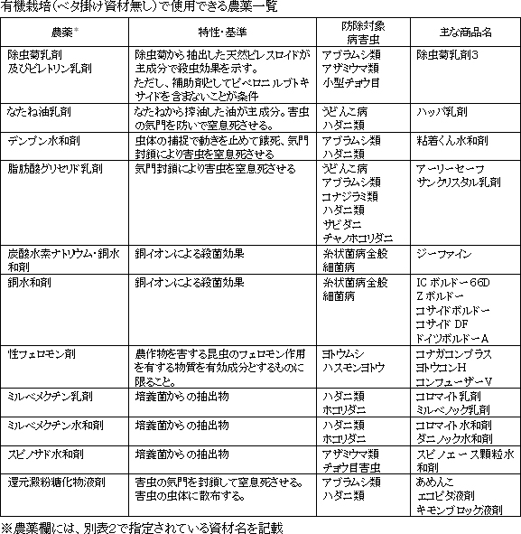 これらを防除するためには、有機栽培で使用できる農薬を使用しかないので、まずは作成する有機栽培暦の防除対象とした病害虫に使用できそうな農薬をピックアップしてみた。