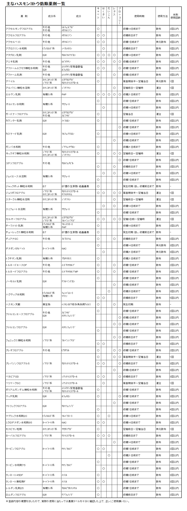 また、秋冬野菜の成長にとって重要な時期である9月以降は、オオタバコガやハスモンヨトウなどの大型チョウ目害虫の活動が活発になるので、これらにも早めの対策をしておく必要がある。