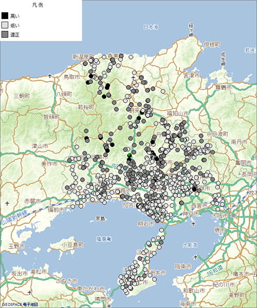 【図4】兵庫県の土壌診断マップ(土壌腐植含量の例、Z-GISを用いてマップ化)
