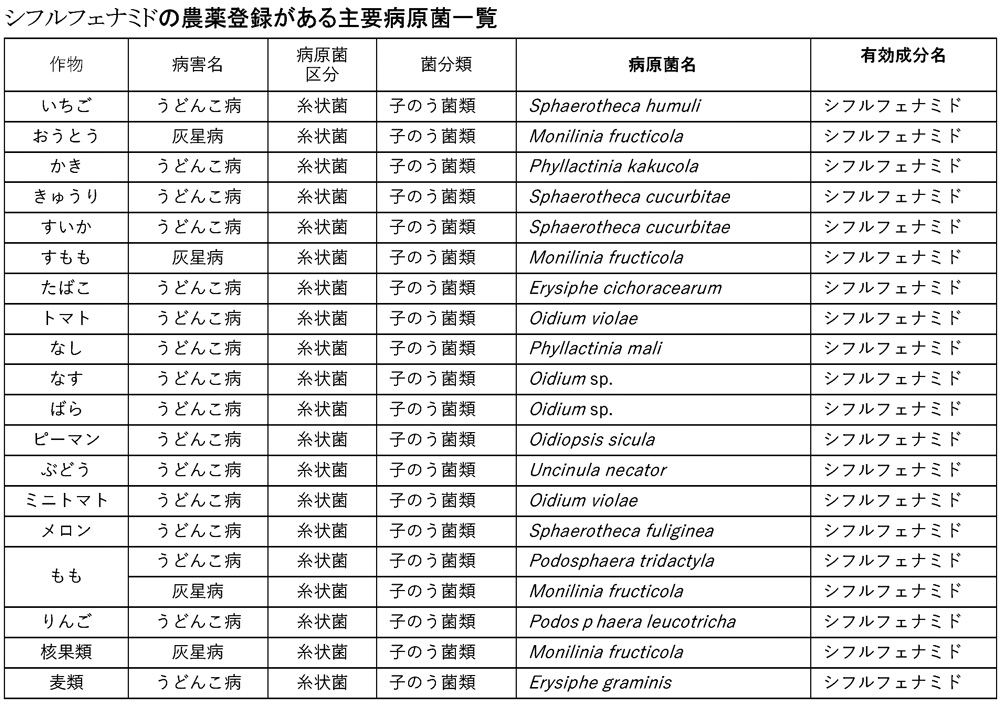 シフルフェナミドの農薬登録がある主要作物・病害名・病原菌別有効成分の一覧を次表に示した。 実際の使用前には必ず製品のラベルにて登録内容(適用作物・使用方法等)を確認して正しく使用してほしい。