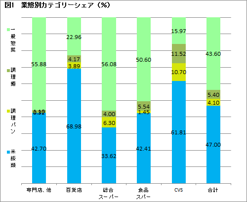 図1は、各業態の惣菜売上高に占める米飯類などの惣菜カテゴリーの占める割合をグラフにしたものだ。