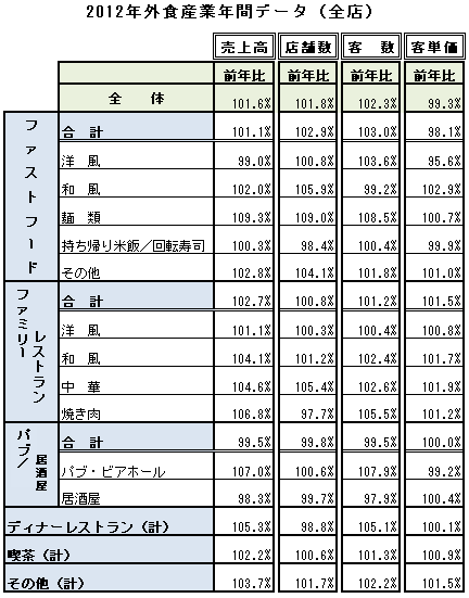 【データで見る外食産業 2012】 年間全店売上2年ぶりに前年を上回る2013年1月29日