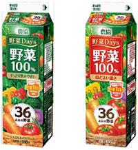 従来品のユーザー調査結果を踏まえ、野菜の数を11種類から36品目に増やすとともに、おいしさをさらに向上させた。また、「砂糖・食塩不使用」の野菜100%タイプであることが伝わるよう、商品名やアイコン位置を改良し、素材そのものの美味しさ訴求を強化した。 「農協 野菜Days 野菜100% すっきり飲みやすい」(にんじんミックスジュース)1000ml、「同 ほどよい濃さ」(トマトミックスジュース)1000mlの価格は、ともに270円(税別)。賞味期間は開封前で15日間(10℃以下要冷蔵)。3月25日から全国発売される。