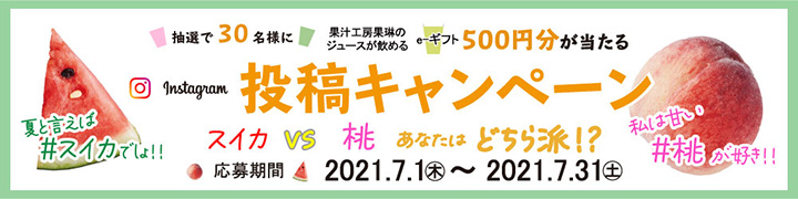 同キャンペーンは、夏の人気商品「とろける桃のスムージー」と「そのまんまスイカ」ジュースの撮影画像を、対象のハッシュタグを付けて投稿すると抽選で30人に、同社のフルーツジュースバーで利用できる「eGift 500円分」をプレゼントする。