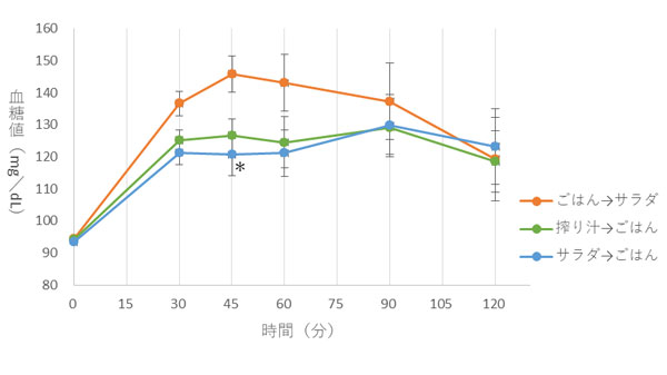 摂取30、45、60、90、120分後の血糖値(*:ごはん→サラダと比較して有意差あり)