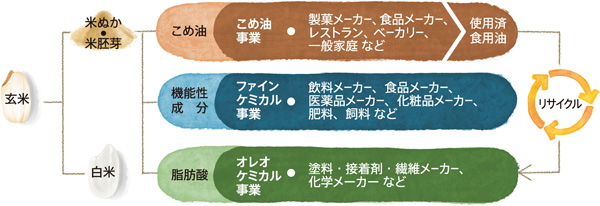 国産原料で製造できるこめ油は、米ぬか・米胚芽を原料として米原油を抽出し、精製工程を経て良質の製品を製造。また、機能性素材は、成分の特徴に応じて化粧品や医薬品、飼料などの原料に使用し製品を開発することで、石油由来の製品や輸入への依存度が高い製品の代替として活用している。さらに、工業用油脂では、こめ油をつくる過程で発生する非可食部の脂肪酸を利用し、インキや接着剤、潤滑油の原料などに使用する工業用の油を製造している。