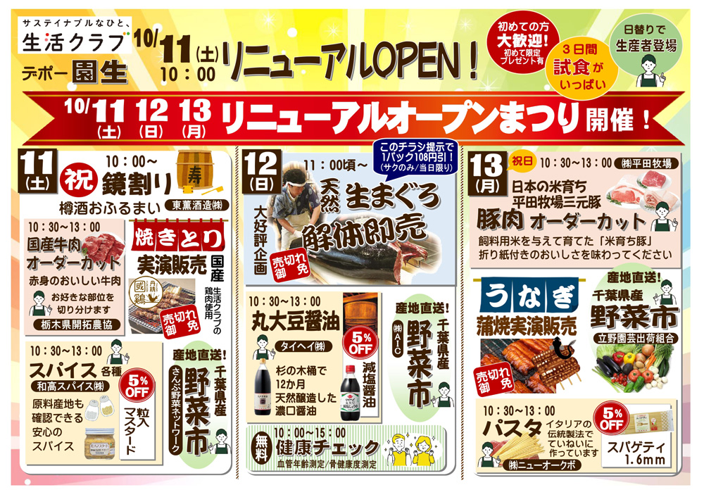 生活クラブ生活協同組合・千葉のお店「デポー園生」(千葉市稲毛区)が、10月11日にリニューアルオープン。これを記念して、10月11日~13日の3日間、リニューアルオープンまつりを開催する。