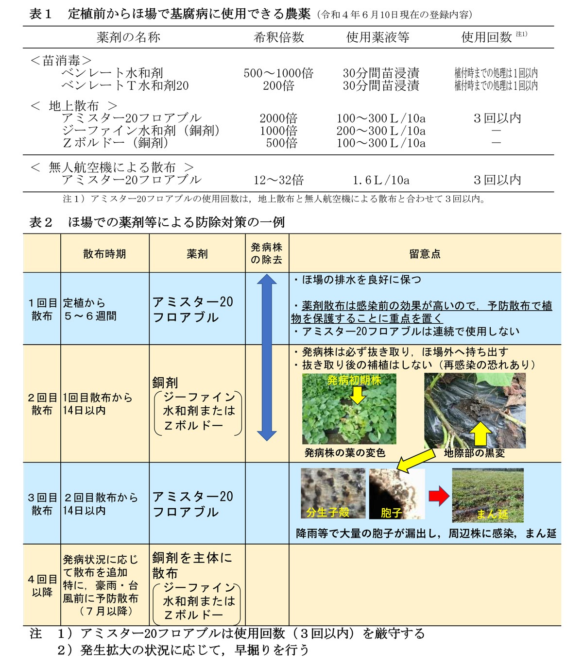 〇5月中旬以降に定植したほ場については、定植5週後を目安に、発生の有無にかかわらず予防的にアミスター20フロアブルを散布する。また、同剤は連続使用せず、ジーファイン水和剤やZボルドーの銅剤と交互に散布する。(表1、表2)