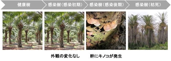 「ガノデルマ」はガノデルマ属糸状菌の総称で、アブラヤシに感染すると、樹は水分伝達機能が阻害されるなどの影響で徐々に実の収量が低下し、やがて枯死する。パーム油の主要生産地であるインドネシアやマレーシアで被害拡大が問題となっているが、現時点で有効な防除方法はなく、感染樹をなるべく早く発見し、伐採することが主な対処法。一方で、感染の初期は目視での判別が難しく、判別できた時には、既に周囲に感染を広げてしまっているケースが多発している(図1)。