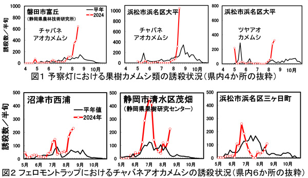 静岡県病害虫防除所によると、県内4か所の予察灯における8月1~20日の合計誘殺数の平均は、1586頭(平年152頭、平年比10.4倍)と平年より多かった(図1)。