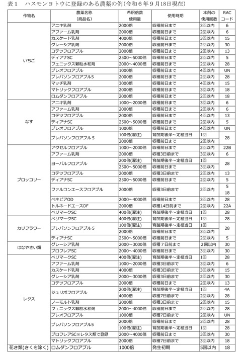 〇中・老齢幼虫に対しては薬剤の効果が劣るため、若齢幼虫期に薬剤防除する(図4、表1)。また、薬剤抵抗性発達の恐れがあるので、同一系統の薬剤の連用は避ける。