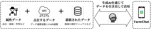農研機構が開発した生成AIをFarmChatから利用することにより、これまで組み合わせて活用することが難しかった農業者の属性、点在する各種農業データ、産地ごとに蓄積されたデータなどを引き出して活用するための出口としての発展に取り組んでいる。