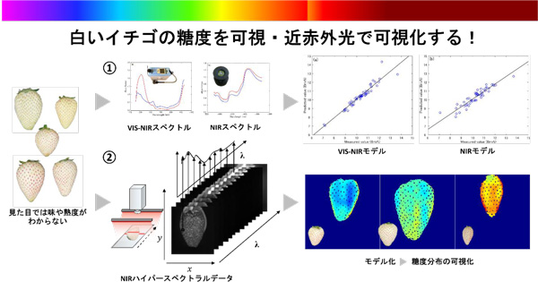 同研究グループは、①可視-近赤外分光法および近赤外分光法により、成熟しても果皮の白いイチゴ(白イチゴ)の糖度を良好な精度で推定することを可能にした。