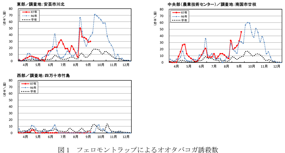 高知県病害虫防除所によると、県内3か所に設置したフェロモントラップ調査おいて、9月第4、5半旬の雄成虫の誘殺数は、オオタバコガで東部59頭(平年18.5頭)中央部で78頭(15.3頭)。タバコガでは東部30頭(平年14.2頭)、中央部で36頭(19.3頭)。いずれも平年より多かった。(図1、2)。