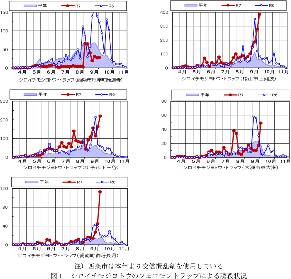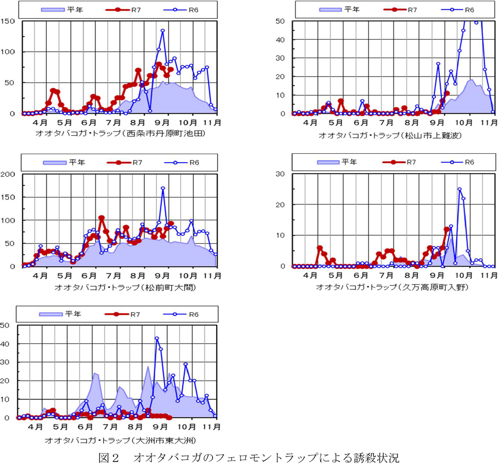 愛媛県病害虫防除所によると、9月第6半旬~10月第1半旬のフェロモントラップによる誘殺数は、シロイチモジヨトウは5地点中4地点で多く平年比の1.6~5.7倍となっている(図1)。また、オオタバコガでは5地点中4地点で多く平年比の1.4~2.5倍となっている(図2)。