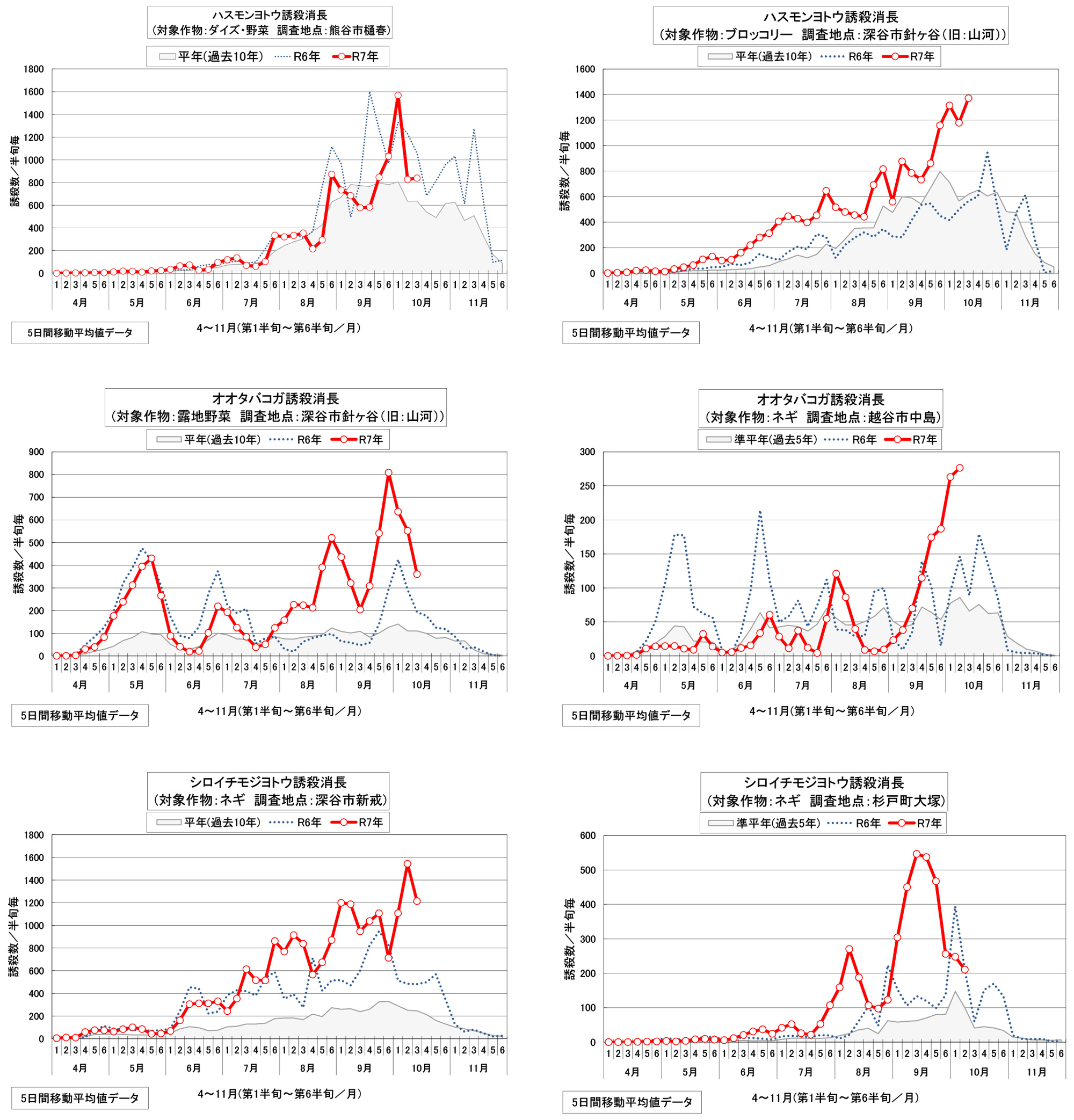 埼玉県病害虫防除所によると、病害虫防除所が県内に設置しているフェロモントラップへの、ハスモンヨトウ、オオタバコガおよびシロイチモジヨトウの雄成虫誘殺数が複数の地点で多く、多発生であった昨年をも上回る誘殺が確認されている地点がある(図)。