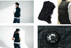 「ファンベスト」は、衣服の中に空気を送り込んで汗を蒸発させ、気化熱によって体を冷却。フル充電時には最大約8時間使用でき、常に衣服内を快適な環境に保つ。バッテリーは254グラムとウェアに取り付けても重さが気にならないコンパクトな仕様。