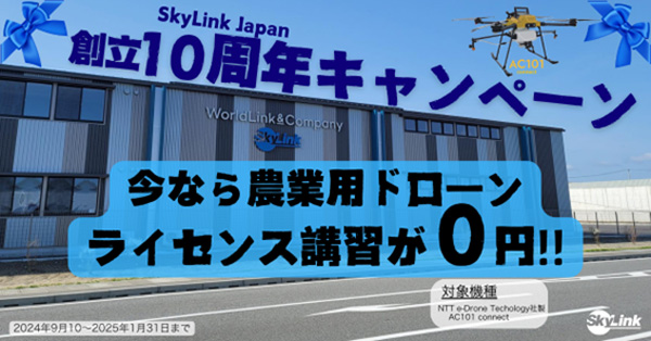 ドローンの販売やソリューションを展開するSkyLink Japanは、創立10周年キャンペーンを2025年1月31日まで実施中。NTT e-Drone Technology社製の農業ドローン「AC101 connect」向けの講習を無料で提供する。