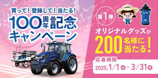 井関農機株式会社は、創立100周年を記念して1/1から3/31まで、オリジナルグッズが合計200名に当たるプレゼントキャンペーンを実施するとした。