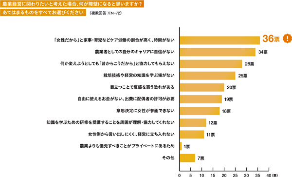 その際に「何が障壁になると思いますか」という質問(複数回答可)には、「『女性だから』と家事・育児などケア労働の割合が高く、時間がない」と回答した方が50%にのぼり、次いで「農業者としての自分のキャリアに自信がない」が47%と、ケア労働の負担と、自信の無さが大きな障壁となることが明らかになった。