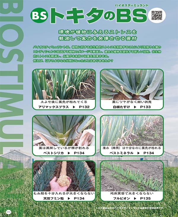 このほか、生産者を強力にバックアップする資材情報として、バイオスティミュラント(BS)資材を紹介。有用菌の力でネギをガッチリ育てる培土「ガッチリくんスーパーねぎ用」をはじめ、植物が本来持つ力を引き出し、非生物的ストレスを軽減する最新資材を多数掲載している。