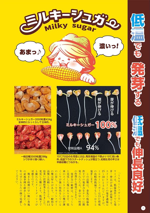 最新カタログは、早先の低温下でもしっかり発芽するスイートコーンの新品種「ミルキーシュガー」シリーズを紹介。千葉県山武市の事例では、1月下旬の播種で高い発芽率を記録するなど、栽培上の利点が際立つ結果となった。そのほかにも事例を多数紹介している。