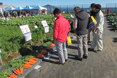 会場では、冬春向けの黄化葉巻病耐性品種トマトで大玉の「桃太郎ホープ」、同ミニトマトの「TY千果」、ベト病に抵抗性のあるホウレンソウ、端境期に出荷可能な、加工用としても使い易いキャベツ「夢舞妓」、新品種で夏まき年内どりのニンジン「翔馬」、新品種で三季どり可能なミニ赤ダイコン「紅三太」など注目の品種が展示紹介された。